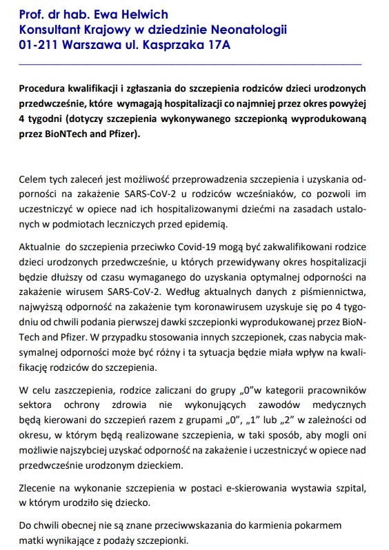Aktualnie do szczepienia przeciwko Covid-19 mogą być zakwalifikowani rodzice dzieci urodzonych przedwcześnie, u których przewidywany okres hospitalizacji będzie dłuższy od czasu wymaganego do uzyskania optymalnej odporności na zakażenie wirusem SARS-CoV-2. Według aktualnych danych z piśmiennictwa, najwyższą odporność na zakażenie tym koronawirusem uzyskuje się po 4 tygodniu od chwili podania pierwszej dawki szczepionki wyprodukowanej przez BioNTech and Pfizer. W przypadku stosowania innych szczepionek, czas nabycia maksymalnej odporności może być różny i ta sytuacja będzie miała wpływ na kwalifikację rodziców do szczepienia.
